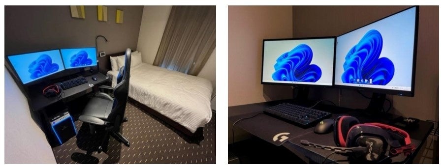 本ルームの企画や構築では NTTe-Sports の調達・アドバイスといった協力を受け、ゲーミングPCなどについては、実証時と同様に「eXeField Akiba※1」で採用しているものと同等のハイスペックなゲーム環境をご用意しております。また、宿泊客からの問合せ対応などサポート体制も整えています※2。